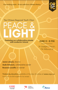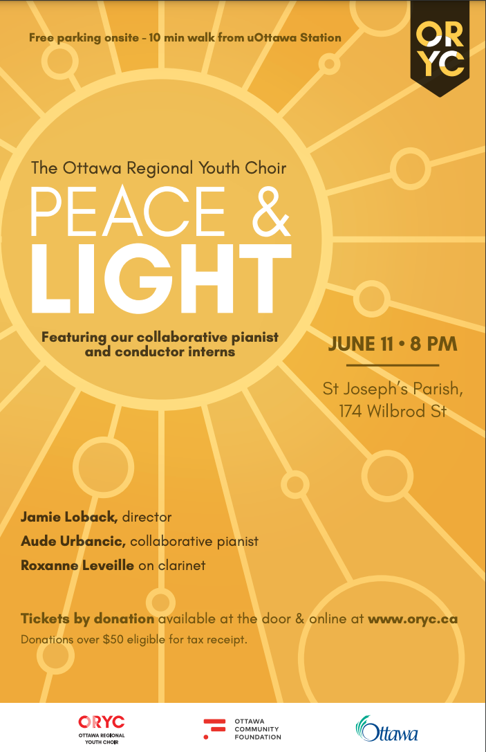 Join the Ottawa Regional Youth Choir in our last concert of the 2022-2023 season for “Peace & Light”: a showcase featuring our conducting and collaborative pianist interns! This joyous event highlights the resilience of our choristers during the past years, as well as the hard work of the group to still learn and excel during the unusual times. Location: St Joseph’s Parish (174 Wilbrod St, Ottawa) Time: June 11, 2022 at 8PM Buy your tickets at the embedded link below: